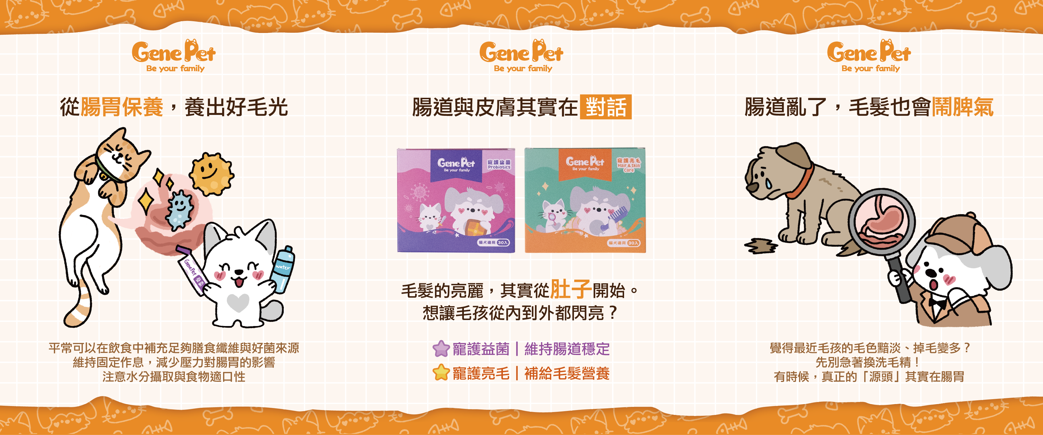 你知道嗎?毛孩的腸胃和皮膚,其實每天都在互相「聊天」這條聯繫,在科學上有個名字——「腸道–皮膚軸線(gut–skin axis)」腸道裡的菌,就像城市的居民,他們會透過免疫訊號和代謝物把訊息「傳遞」到全身,連皮膚也收得到當腸道維持穩定、消化順暢時營養就能順利送到皮膚與毛髮但如果腸胃亂了陣腳毛孩的皮膚、毛髮也可能跟著「不開心」腸道亂了,毛髮也會「鬧脾氣」覺得最近毛孩的毛色黯淡、掉毛變多?先別急著換洗毛精有時候,真正的「源頭」其實在腸胃當腸道菌相失衡時身體的免疫反應可能變得「太過積極」皮膚的屏障就容易受到影響。再加上腸胃吸收力下降像蛋白質、脂肪酸這些營養補給不足毛髮自然就失去原本的光澤感也就是說——毛孩的毛況,其實是腸道健康的「鏡子」從腸胃保養,養出好毛光想讓毛孩毛髮柔亮,不一定只能靠外在護理有時候,答案藏在「腸胃」當腸道穩定時消化吸收順利、營養輸送自然流暢皮膚與毛髮就能維持在理想狀態平常可以這樣做飲食中補充足夠膳食纖維與好菌來源維持固定作息,減少壓力對腸胃的影響 注意水分攝取與食物適口性
