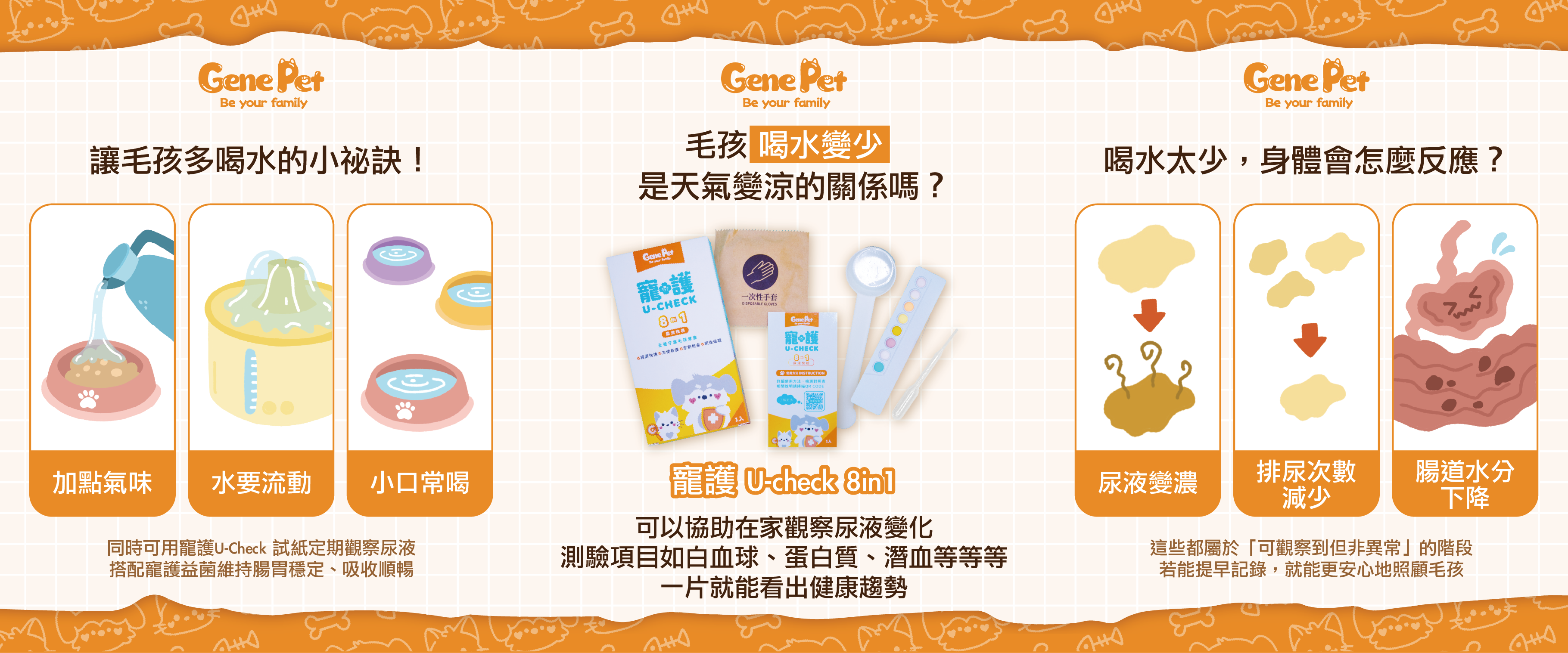 最近天氣變涼是不是發現毛孩好像不太愛喝水?其實這是很常見的現象~氣溫下降後,體表散熱減少、活動量也變低毛孩的「口渴感」自然就下降了但喝水變少代表尿液會變得更濃、代謝壓力也會上升所以飲水量的變化其實是身體正在「給提示」的小訊號呢 喝水太少,身體會怎麼反應?當天氣變涼、毛孩喝水變少時,身體其實會出現一些小變化 尿液變濃:顏色深、味道重 排尿次數減少:可能增加泌尿壓力 腸道水分下降:糞便變乾、排便不順這些都屬於「可觀察到但非異常」的階段。若能提早記錄,就能更安心地照顧毛孩。 讓毛孩多喝水的小祕訣!家長們不用擔心毛孩喝水變少我們也是有方法能主動改變的想讓毛孩多喝水,其實不難以下三個小技巧,可以幫助提升「飲水意願」加點「氣味」:在飼料或罐頭裡加入少量溫水、湯汁,能讓氣味更吸引人。水要「流動」:貓咪特別喜歡流水感、喝新鮮的水,可使用循環式飲水機提升主子喝水意願 小口常喝:在家多放幾個水碗、調整位置,也可以讓毛孩更願意主動喝。 同時可用寵護U-Check 試紙定期觀察尿液、搭配寵護益菌維持腸胃穩定、吸收順暢。從喝水到代謝,讓照顧更安心 檢測準確度小提醒為確保最佳檢測結果,建議於 排尿後 10 分鐘內完成測試。若尿液放置過久、取樣容器不乾淨、試紙受潮,或手部/容器殘留清潔劑等外在因素,可能造成約 5% 的誤差值,屬正常範圍喔!