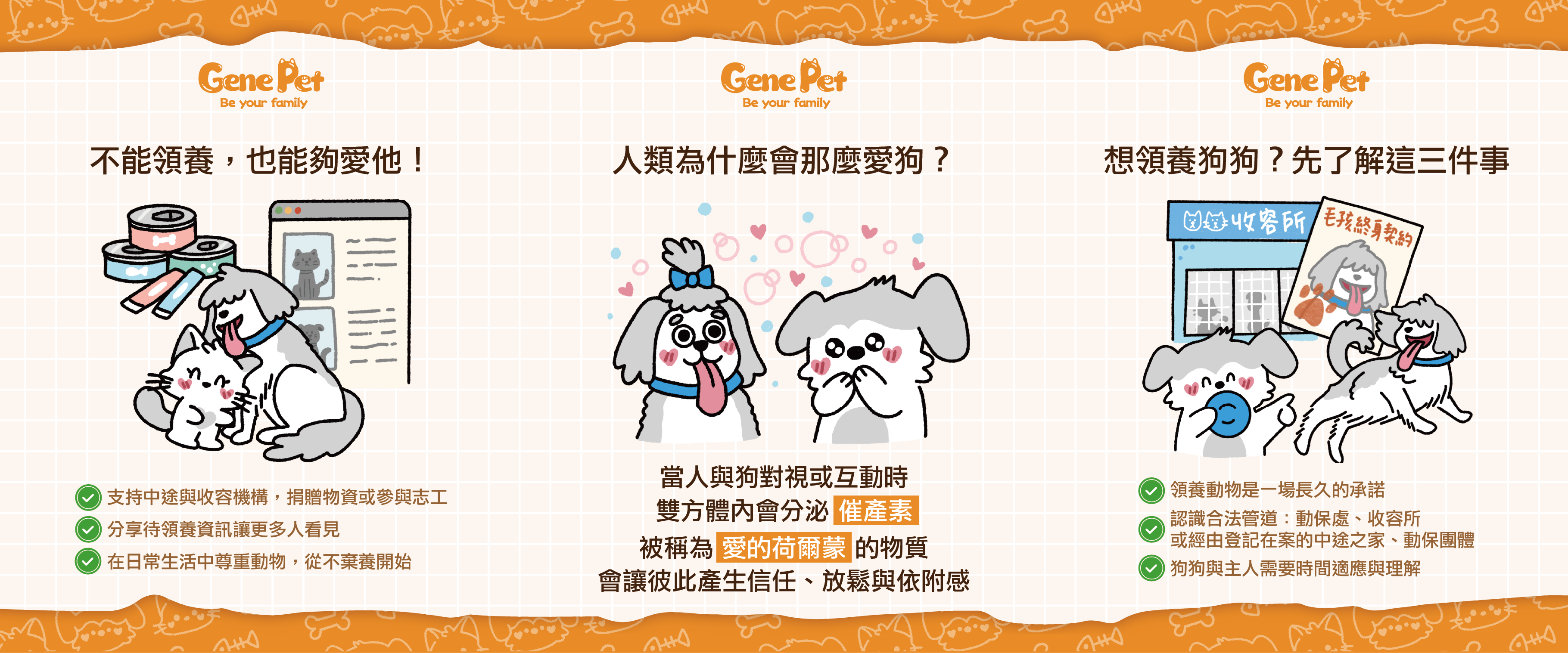 都說狗狗是人類最好的朋友究竟為什麼人類這麼喜歡這個毛絨絨的小生物?科學研究發現,當人與狗對視或互動時,雙方體內都會分泌「催產素(oxytocin)」——這種被稱為「愛的荷爾蒙」的物質,會讓彼此產生信任、放鬆與依附感。也難怪,狗狗望著我們時的那雙眼,能讓人卸下防備、感到被理解。牠們用陪伴填滿我們的生活,而我們,也在照顧牠們的過程中,找回「被需要」的幸福感。想領養狗狗?先了解這三件事你也喜歡狗勾且想要有一隻自己的毛小孩嗎?那也可以考慮領養這個方式喔!在台灣,「領養代替購買」不只是一句口號每年仍有上萬隻狗狗等待被帶回家如果你正在考慮領養的話,以下三件事很重要 1. 評估自身狀況你是否有足夠的時間和心力照顧?房東允許飼養嗎?領養不只是感動的瞬間,而是一場長久的承諾。 2. 認識合法管道可前往各縣市動保處、收容所,或經由登記在案的中途之家、動保團體領養。這些機構會進行篩選、試養,確保人與狗勾的匹配度。 3. 領養不是結束,而是開始狗狗需要時間適應新環境,也需要主人的理解與耐心。不能領養,也能夠愛他不是每個家庭的狀況都適合養狗勾如果目前條件不允許領養一隻自己的寶貝「愛」依然有很多種方式喔!我們可以:支持中途與收容機構,捐贈物資或參與志工分享待領養資訊,讓更多人看見在日常生活中尊重動物,從不棄養開始愛,不一定要擁有。有時只是一次關注、一個分享、一點理解,我們就能讓狗勾們知道——世界仍然值得信任
