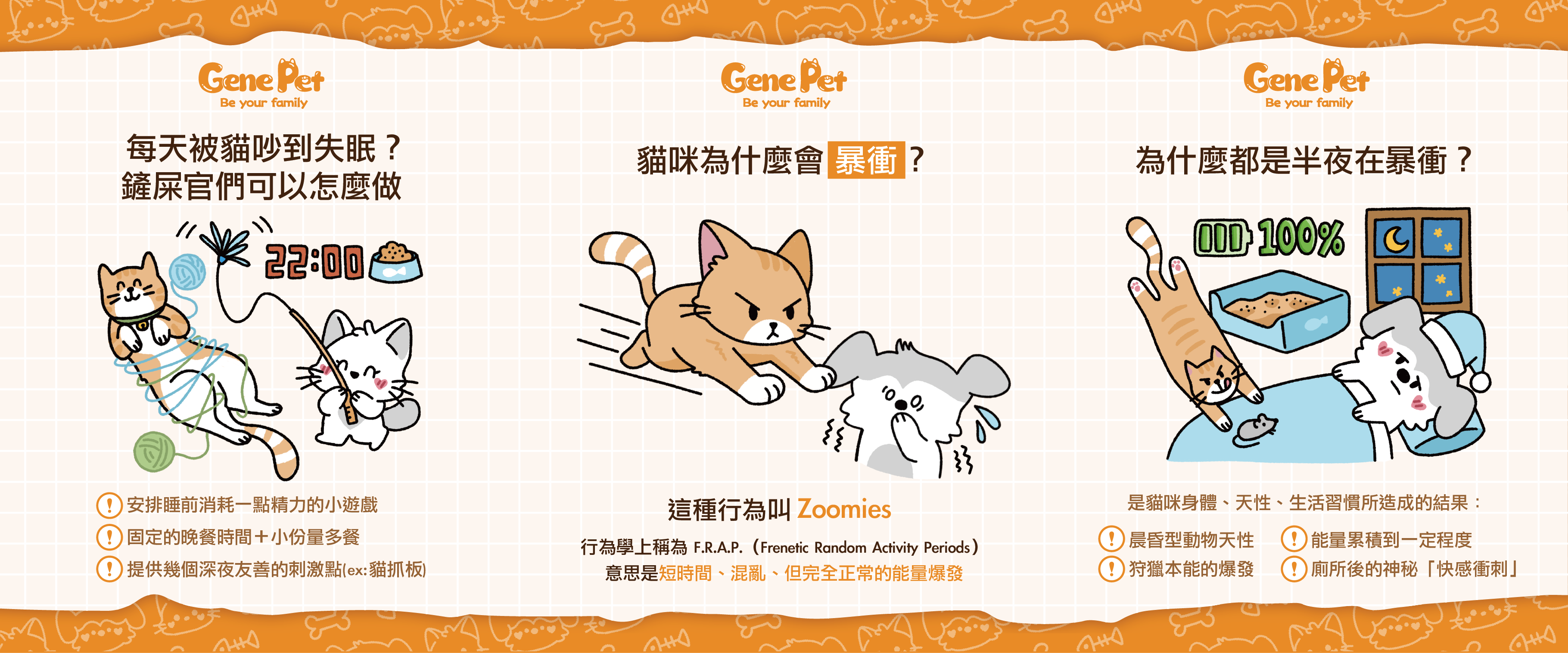 你家貓貓也會半夜突然狂奔嗎?像被按下加速鍵,一下衝上沙發、一下飛過走廊這種行為其實有名字,叫ZoomiesZoomies是指突然爆發的高速亂跑、跳躍、繞圈在狗狗和貓咪身上都能常常見到行為學上稱為 F.R.A.P.(Frenetic Random Activity Periods)意思是「短時間、混亂、但完全正常的能量爆發」所以貓咪不是壞掉了,也不是被附身而是在釋放「堆積一整天的活動量」!牠們的身體設計,就是用高強度短衝刺來運動的 為什麼都是半夜在暴衝?其實貓咪「半夜瘋跑」不是故意要叫飼主起床重睡而是身體、天性、生活習慣一起造成的結果①晨昏型動物天性貓咪天生在黎明與黃昏最活躍如果剛好你的作息讓牠睡得比較晚牠的「黃昏活躍期」就被延後到深夜②狩獵本能的爆發貓的本能是:短暫追逐 →撲咬→ 放鬆。家裡沒有刺激、白天睡很飽,夜晚就成了「狩獵練習時間」③能量累積到一定程度如果白天互動少、沒有追玩具、環境太安靜能量就會在某個時間一次爆發出來④廁所後的神秘「快感衝刺」很多貓上完廁所會像被火箭推進一樣奔出去這在行為學裡也被記錄成一種「興奮切換」反應 每天被貓吵到失眠?鏟屎官們可以怎麼做Zoomies 是一種完全正常的行為但如果剛好都落在你的睡覺時間可以從生活方式做一些溫和的調整:①安排睡前「消耗一點精力」的小遊戲不需要玩很久,5–10 分鐘剛剛好羽毛棒、逗貓棒、追逐類玩具最有效②固定的晚餐時間+小份量多餐很多貓在吃完飯後比較放鬆、容易入睡把主餐時間往前或往後調 1 小時有時就能換來更安靜的夜晚③提供幾個「深夜友善」的刺激點像是窗口視野、貓抓板、紙箱小洞洞、軟玩具讓貓咪半夜醒來也有可以自己玩的東西,不需要衝刺整個房間最後要再提醒一下Zoomies 本身是一種正常的能量爆發,而非壞行為但若影響到鏟屎官們的睡眠,只要稍微調整日常你和貓咪都能擁有更舒服的夜晚
