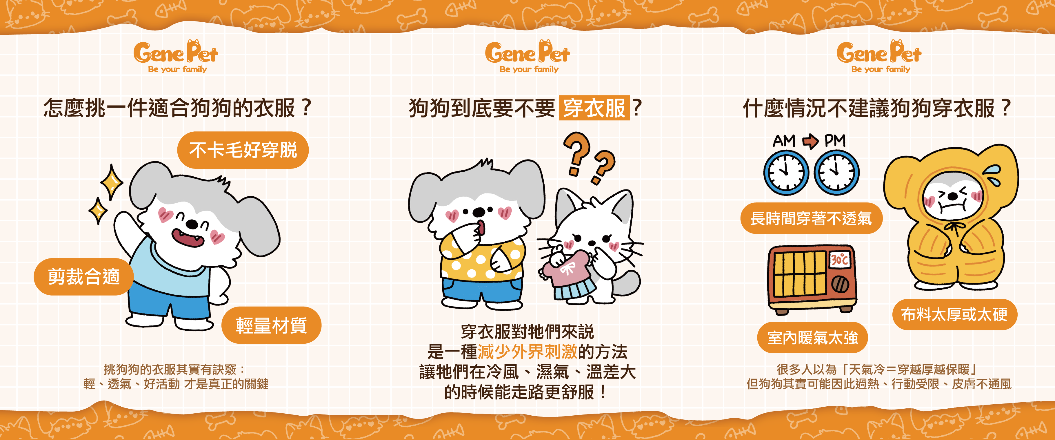 有些狗冬天穿外套像小模特兒 有些則是死不穿臉超臭但其實穿衣服對狗狗來說不是「可愛」或「潮不潮」的問題而是 體型、毛量、年齡 等因素綜合決定的!短毛犬、幼犬、老犬,在氣溫下降時身體保溫效率本來就比較弱像臘腸、吉娃娃這類小型犬,對冷的耐受度也更低 穿衣服對牠們來說是一種「減少外界刺激」的方法讓牠們在冷風、濕氣、溫差大的時候能走路更舒服! 什麼情況不建議狗狗穿衣服?— 不是越厚越好!很多人以為「天氣冷=穿越厚越保暖」但狗狗其實可能因此 過熱、行動受限、皮膚不通風以下狀況反而不適合穿:• 室內暖氣太強 → 其實很熱 • 布料太厚或太硬 → 卡毛+摩擦腋下不舒服• 長時間穿著不透氣 → 皮膚會悶悶的 剛運動完體溫高,也不適合立刻加衣服而長毛犬(像博美、黃金)本身就有天然的“保暖外套” 其實也不太需要再額外穿衣服 怎麼挑一件適合狗狗的衣服?— 舒適比可愛更重要挑狗狗的衣服其實有訣竅:輕、透氣、好活動 才是真正的關鍵 挑選可以記住 3 點: 輕量材質:棉、薄刷毛、機能布都不錯 剪裁合適:脖子、胸口、腋下能放進兩指 不卡毛好穿脫:魔鬼氈、縫線位置要注意 如果狗狗穿上後不想動、耳朵往後、一直抓衣服,就是拒絕訊號可以更換衣服試試看或是不喜歡的話就不勉強啦~